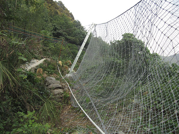 被動(dòng)邊坡防護(hù)網(wǎng)的柔性和攔截強(qiáng)度足以吸收和分散傳遞500KJ以?xún)?nèi)的落石沖擊動(dòng)能,消能環(huán)的設(shè)計(jì)和采用使系統(tǒng)的抗沖擊能力得到進(jìn)一步提高SNS被動(dòng)防護(hù)網(wǎng)與剛性攔截和砌漿擋墻相比較,改變了原有施工工藝,使工期和資金得到減少。被動(dòng)邊坡防護(hù)網(wǎng)適用于建筑設(shè)施旁有緩沖地帶的高山峻嶺,把巖崩、飛石、雪崩、泥石流攔截在建筑設(shè)施之外,避開(kāi)災(zāi)害對(duì)建筑設(shè)施的毀壞。被動(dòng)邊坡防護(hù)網(wǎng)材質(zhì):鋼絲繩網(wǎng)、支撐繩和減壓環(huán)構(gòu)造:由鋼絲繩網(wǎng)或環(huán)形網(wǎng)(需攔截小塊落石時(shí)附加一層鐵絲格柵)、固定系統(tǒng)(錨桿、攔錨繩、基座和支撐繩)、減壓環(huán)和鋼柱四個(gè)主要部分構(gòu)成。