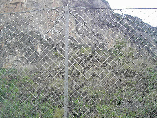 被動(dòng)邊坡防護(hù)網(wǎng)由鋼絲繩網(wǎng)或環(huán)形網(wǎng)(需攔截小塊落石時(shí)附加一層鐵絲格柵),固定系統(tǒng)(錨桿、攔錨繩、基座和支撐繩)、減壓環(huán)和鋼柱四個(gè)主要部分構(gòu)成。鋼柱和鋼絲繩網(wǎng)連接組合構(gòu)成一個(gè)整體,對(duì)所防護(hù)的區(qū)域形成面防護(hù),從而阻止崩塌巖石土體的下墜,起到邊坡防護(hù)作用。